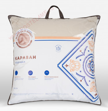 Ткань 100% микрофибра, плотность 85г/м2; наполнитель ядра подушки высокосиликонизированное микроволокно; цвет сливочный с логотипом верблюда