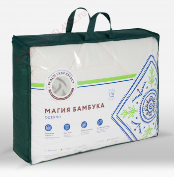 Одеяло «Магия бамбука» – это качественный продукт для сегмента эконом-класса. Стеганое одеяло с наполнителем из бамбукового и вискозного волокна в «упаковке» из шелковистой микрофибры предлагается в двух цветах, сливочном или белом. В каталоге есть три размера всесезонных (300г/м2) и легких (150г/м2) одеял: полутораспальные, двуспальные и евростандарт. Бамбуковое одеяло легкое и объемное, оно хорошо пропускает воздух. В качестве ухода одеялу рекомендуется регулярное проветривание. Как и все изделия из коллекции «Комфорт», это одеяло продается в фирменном ПВХ-пакете с ручками и красочной инструкцией.
